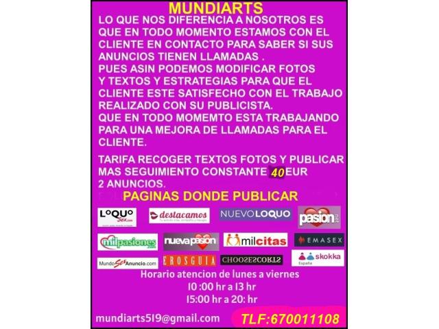 Hola que tal? mundiarts scorts publicidad confecciona y diseÑa lo mejores anuncios para scorts de todo genero. pero lo mas inportante es el seguimiento constante personalizado despues de haber publicado el anuncio. todo via tlf, whatssap, email. normalmente segun que publicista te hace el anuncio lo publica y se desentiende si ese anuncio funciona o no, se cobra y hay la suerte de cada scort´. . . . . . . eso no es asi. . . . . lo que nos diferencia en mundiarts que en todo momento estamos en contacto con el cliente, para saber si el cliente tiene llamadas , pues asin podemos modificar fotos, textos y provar algunas estrategias para captar llamadas. asin el cliente esta aropado por su publicista . las tarifas segun a consultar segun la cantidad de los anuncios se quieran. mas de 20 paginas donde publicarse desde pago a gratuitos, no en todas las ciudades es igual varian donde anunciarse. espero haya gustado este pequeÑo resumes . porfabor llamanos y te asesoramos mejor tlf: 670011108. . atentamente mundiarts nacionalidad: española edad: 58 años