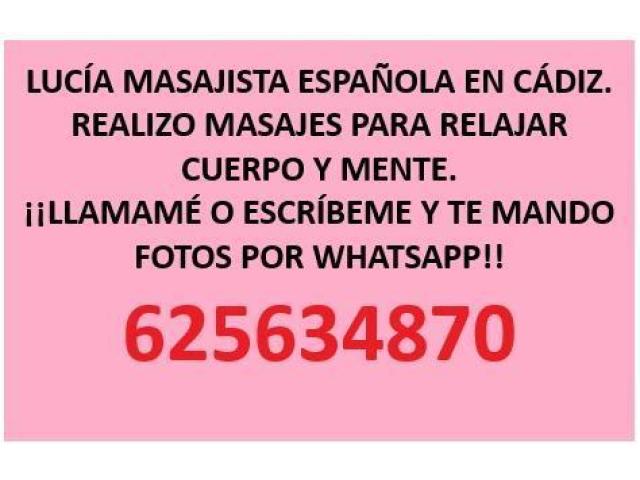 Lucia masajista espaÑola en cÁdiz capital 35, aÑos. realizo masajes espectaculares. soy cariÑosa, amable, y muy . si quieres que te mande mÁs fotos escrÍbeme por whatsapp 625634870. telefono: 625634870 nacionalidad: española edad: 35 años